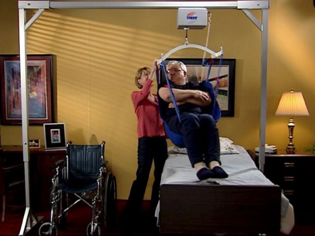Caregivers may need to transport a patient using a hoyer lift at home or in the hospital.